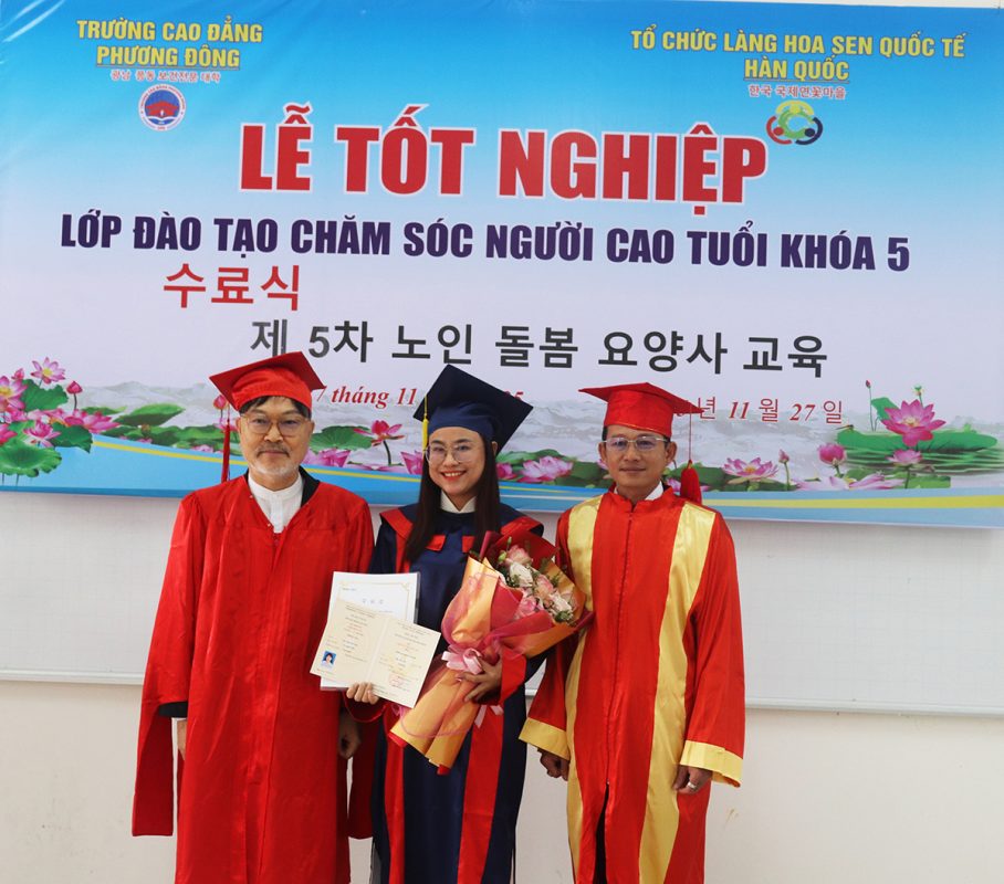 Tham dự có ông Cho Dang Ho – Chủ tịch Làng Hoa sen quốc tế Hàn Quốc tại Việt Nam; thầy Huỳnh Ngọc Hợi – Hiệu trưởng Trường Cao đẳng Phương đông, các thầy cô giáo của nhà trường và 19 học viên tốt nghiệp.