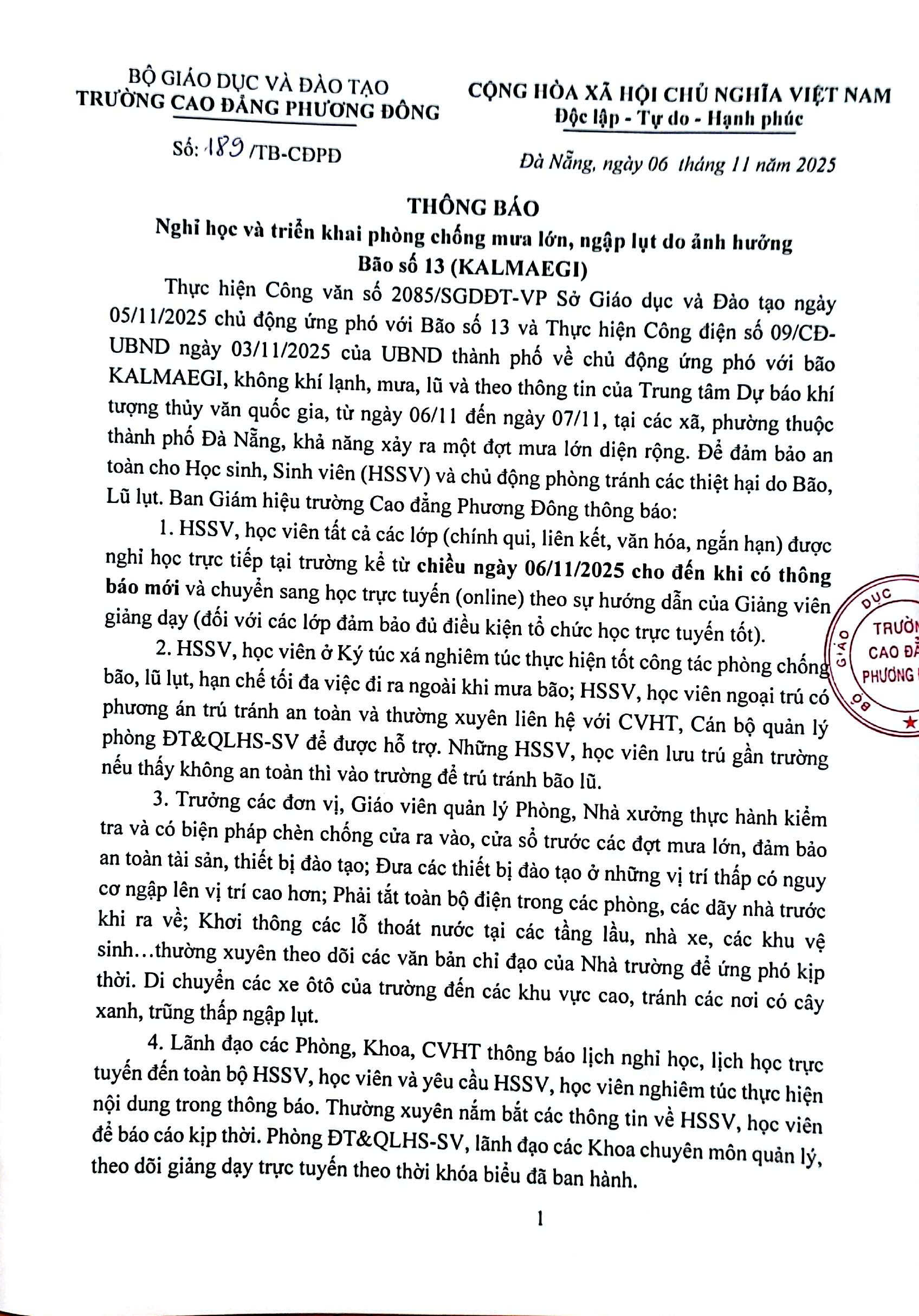 Trước tình hình bão số 13 KALMAEGI có khả năng gây mưa lớn diện rộng từ ngày 06/11 đến 07/11/2025, Trường Cao đẳng Phương Đông thông báo đến toàn thể CBGV–NV, HSSV như sau: