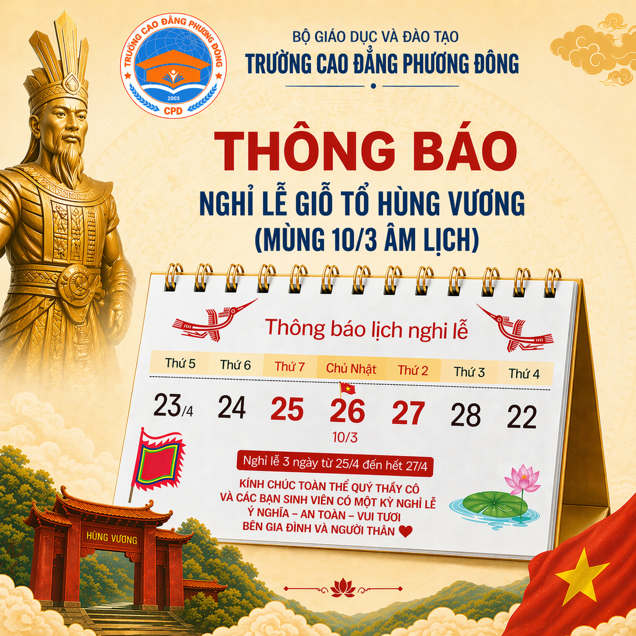 Trường Cao đẳng Phương Đông trân trọng thông báo đến toàn thể CBGVNV và HSSV về lịch nghỉ lễ Giỗ Tổ Hùng Vương như sau:
